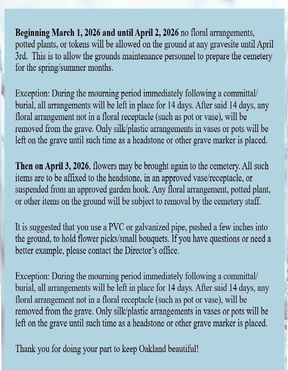 The Russellville Oakland Cemetery Commission meets regularly on the 3rd Tuesday of each month at 5:30 PM on the 2nd floor of City Hall. The public is welcome to attend.
